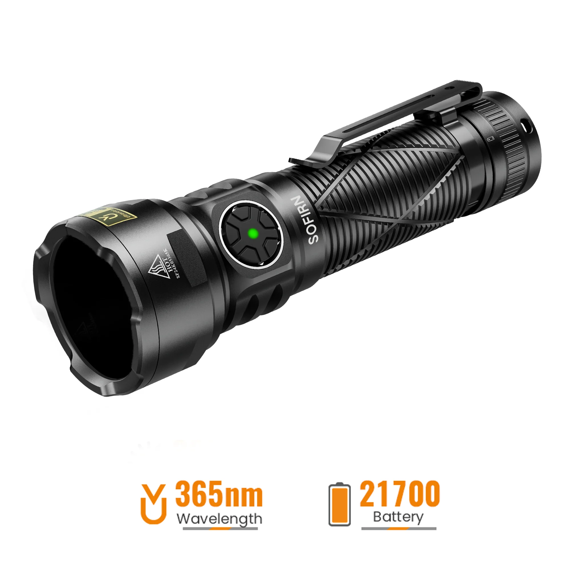 The included 5000mAh 21700 battery provides up to 2.5 hours of continuous UV output. Press the button once when the light is off to display the battery level for 5 seconds (green/red LED indicators).